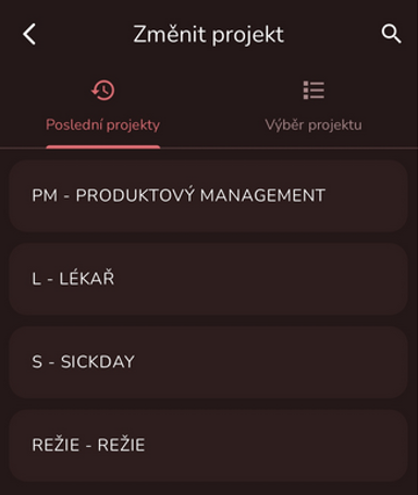 Při výběru možnosti Projekt a Homeoffice následně uživatel musí vybrat projekt. Toto bylo popsáno výše.