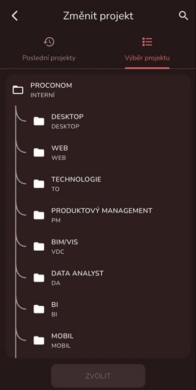 Na kartě „Výběr projektu“ uživatel vidí stromové zobrazení prostředí. Zde je zapotřebí aby klikáním na složkovou úroveň postupně našel projekt, na kterém má pracovat. Uživatel může hledat projekt skrze kliknutí na ikonu lupy v pravém horním rohu. Po zadání hledaného výrazu se na kartě posledních projektů zobrazí projekty s největší shodou. Na kartě „Výběr projektu“ se rozbalí ve stromovém zobrazením úroveň, která obsahuje položku s největší shodou. Po nalezení projektu a jeho zvolení se projekt podbarví červenou barvou a uživatel může potvrdit výběr tlačítkem „Zvolit“ ve spodní části obrazovky.