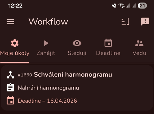 Uživatel může vyřizovat úkoly na kartě „Moje úkoly“ s ikonou ozubeného kola. Kartu zvolí kliknutím na název s ikonou v horní liště karet.