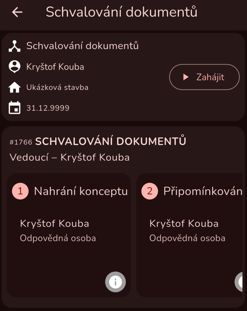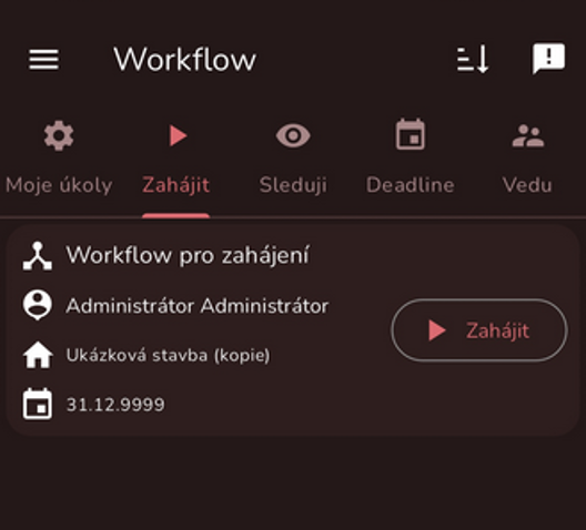 Zahájení procesu uživatel provede na kartě „Zahájit“ označené ikonou šipky mířící doprava . Po kliknutí/přejetí na tuto kartu se zobrazí seznam workflow, které uživatel vede, ale nejsou zahájena. V dlaždici procesu jsou zobrazeny tyto údaje.: