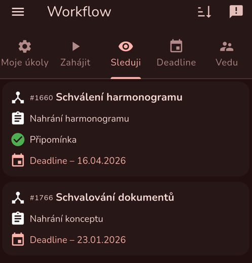 Zahájení procesu uživatel provede na kartě „Sleduji“ označené ikonou oka .