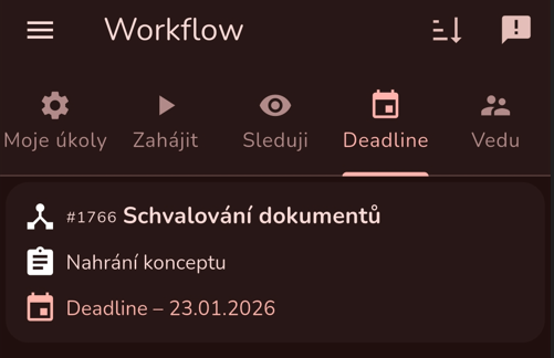 Uživatel může spravovat procesy po termínu na kartě „deadline“ s ikonou kalendáře .