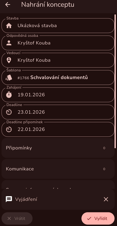 Uživatel může při schvalování či vrácení kroku napsat vyjádření k výsledku kroku. Toto vyjádření uvidí všechny osoby zapojené do procesu. Jedná se o formu odůvodnění. Uživatel se nemusí vyjádřit pro posun kroku.