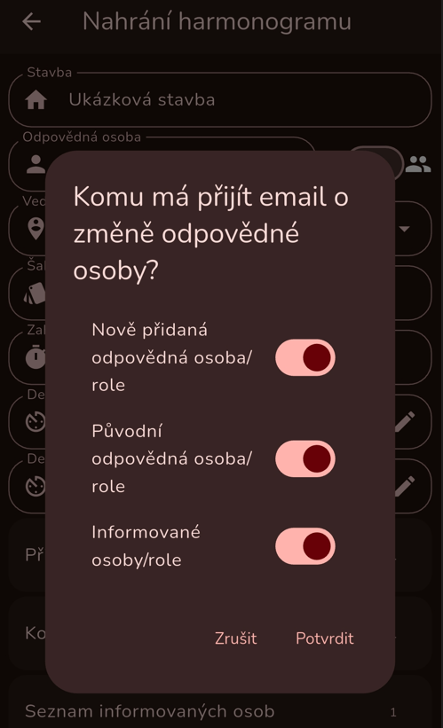 Vedoucí osoba může změnit odpovědnou osobu/roli kliknutím na combobox „Odpovědná osoba/role“. Kliknutím na combobox rozbalí uživatel nabídku uživatelů s právem na stavbu a kliknutím na požadovaného uživatele potvrdí volbu. V novém okně zvolí uživatel komu se notifikace o změně odpovědné osoby/role odešle a uloží volbu tlačítkem „Potvrdit“.