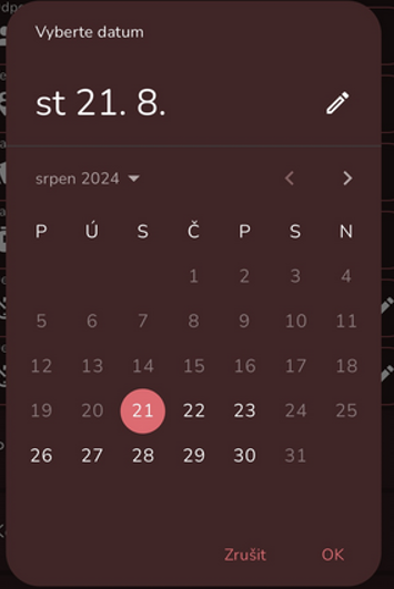 Vedoucí osoba může změnit termín úkolu a připomínek kliknutím na ikonu tužky v daném poli . Po kliknutí na ikonu se zobrazí okno s kalendářem, kde uživatel zvolí nové datum a volbu potvrdí tlačítkem „OK“ v pravém dolním rohu. Zrušení změny provede stisknutím tlačítka „Zrušit“.