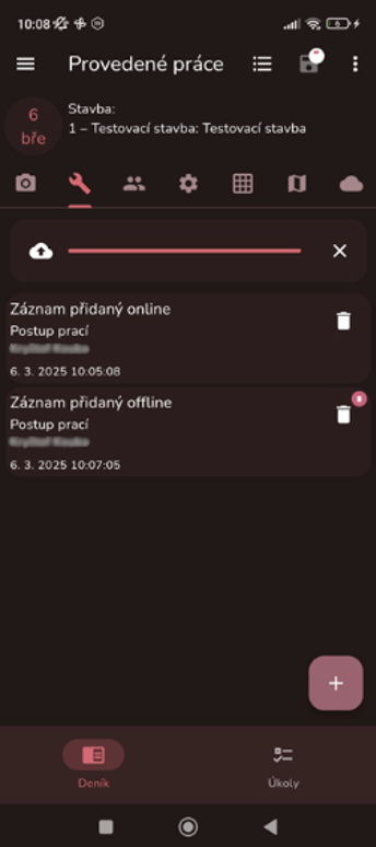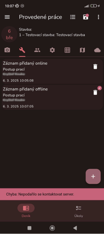 Pro offline práci s deníkem musí uživatel otevřít požadovaný stavební deník ještě v režimu online a až poté přejít do režimu offline (vypnutí Wi-Fi/Dat).