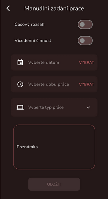 Tyto přepínače následně mění pole pod nimi. Pokud uživatel chce zadávat vícedenní činnost, tak může zvolit, zda se činnost vykonává pouze v pracovní dny či ne.