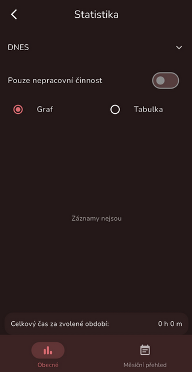 Pod časomírou docházky se nachází tlačítko „Statistika“. Po kliknutí na tlačítko se otevře obrazovka se statistikou samotnou.