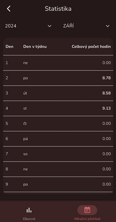 V této kartě se nachází měsíční rekapitulace. Mezi kartami lze přepínat kliknutím na jejich název ve spodní liště obrazovky.