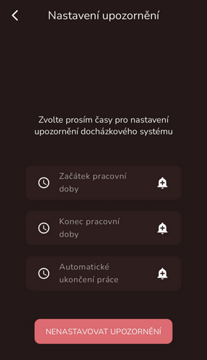 Vespod obrazovky se nachází šedé tlačítko „Nastavení“. Po kliknutí na něj se uživateli zobrazí na nové obrazovce možnosti nastavení upozornění na docházku.