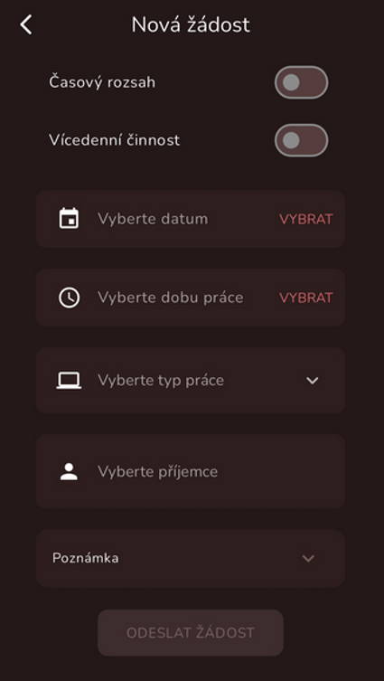 Nyní uživatel musí vyplnit typ práce a příjemce dané žádosti.