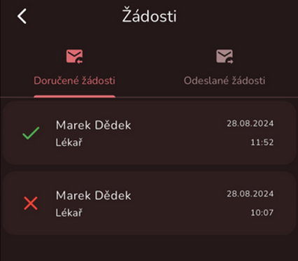 Na této kartě uživatel nalezne seznam žádostí, které mu přišly od jiných uživatelů.