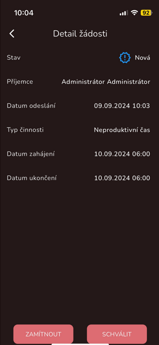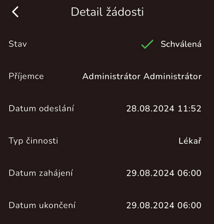 Kliknutím na žádost uživatel otevře detail žádosti. Pokud je žádost nevyřízená, uživatel může žádost schválit nebo zamítnout tlačítky ve spodní části obrazovky.