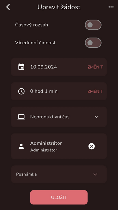 Na nové obrazovce uživatel může upravit žádost stejně jako bylo popsáno v kapitole Zpětné doplnění docházky.