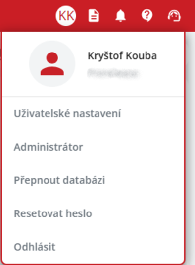 Administrátor může otevřít administrátorské okno skrze uživatelské menu. Menu se otevře po kliknutí na ikonu v horní liště programu s iniciály uživatele