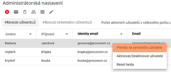 Servisní uživatel lze převést z tabulky normálních uživatelů. Administrátor tak provede skrze kontextové menu vyvolaném pravým tlačítkem myši na řádku uživatele, který má být převeden. Poté administrátor zvolí možnost „Převést na servisního uživatele“.
