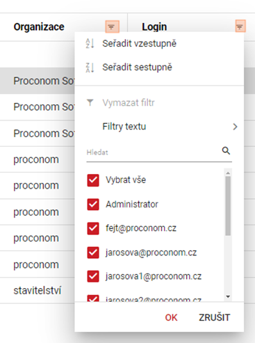 V tabulce lze filtrovat ikonami filtru vpravo od názvu sloupce. Filtrování se provádí kliknutím levým tlačítkem myši na ikonu. Přetažením sloupců lze tabulku upravovat.