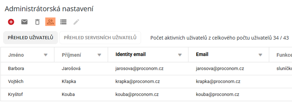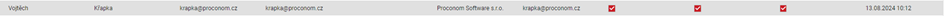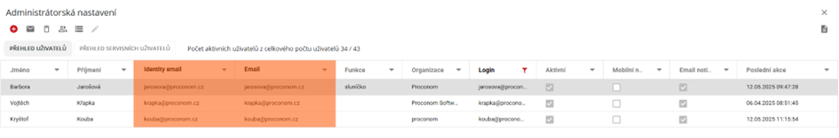 V tabulce se nachází dva sloupce pro email. Identity email je adresa, skrze kterou se uživatel přihlašuje. Sloupec Email zobrazuje adresu, na kterou budou chodit notifikace z programu.