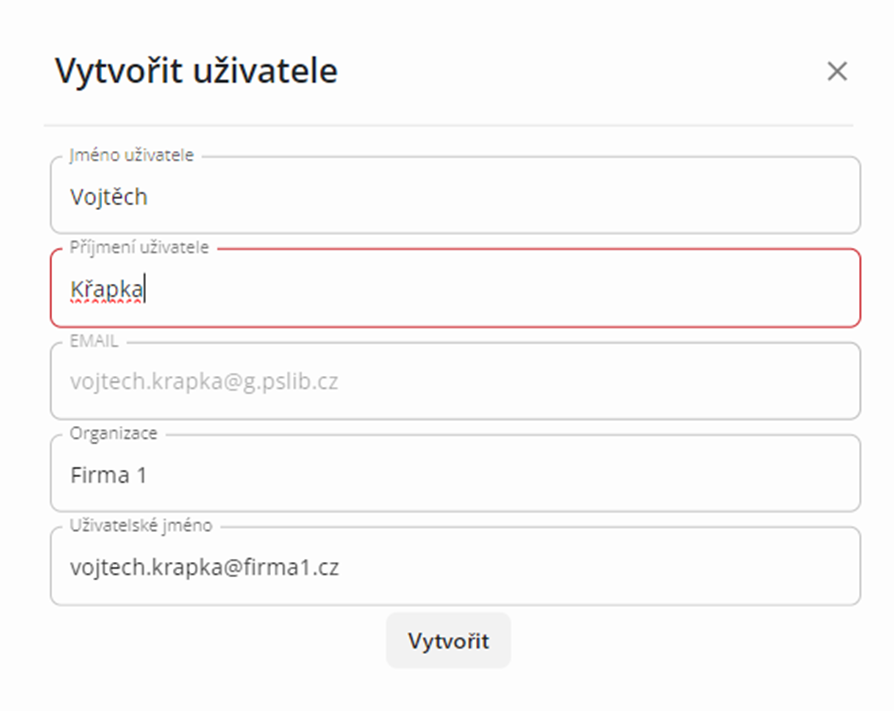 V novém dialogovém okně uživatel vyplní jméno, příjmení a název organizace. Může nastavit i přihlašovací uživatelské jméno, které se však vyplní automaticky na email dané osoby. Zakládání se potvrdí zmáčknutím tlačítka „Vytvořit“ ve spodní části okna. Zrušení zakládání lze provést zmáčknutím tlačítka křížku.