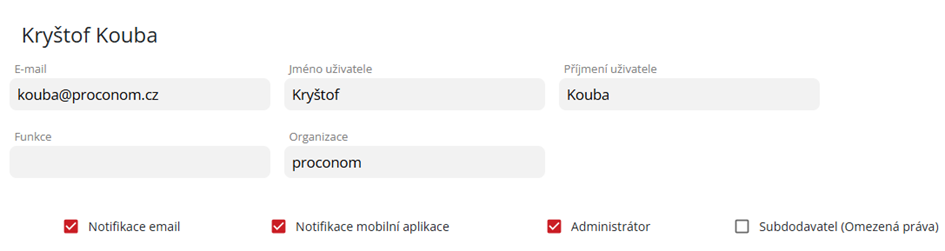 V základním nastavení uživatele může administrátor přepisovat tyto údaje: