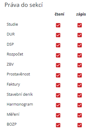 Práva do sekcí, které se nacházejí v levé části obrazovky, upravují, jaké moduly upravovaný uživatel vidí (čtení) a se kterými může pracovat (zápis). Zaškrtnuté pole znamená, že je daný sloupec povolen. Odškrtnuté znamená, že je sloupec nepovolen.