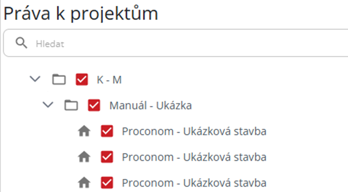 V této části může administrátor nastavit, jaké útvary a stavby uživatel uvidí. Zaškrtnuté checkboxy s fajfkou znamenají, že je útvar a stavba pro uživatele viditelná. Rozbalení úrovně (zobrazení obsahu pod útvarem) lze provést kliknutím na ikonu šipky u checkboxu nebo dvojklikem levým tlačítkem myši na danou úroveň.
