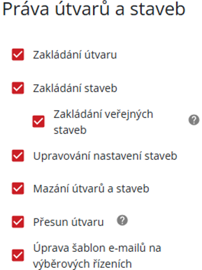 V této části jsou popsány nastavení týkající se útvarů a staveb. U složitějších práv jsou za názvem ikony s otazníkem. Po najetí kurzorem na otazník a počkání se zobrazí nápověda, co daná možnost znamená.