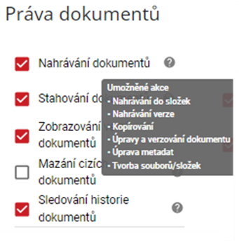 V této části jsou popsány nastavení týkající se dokumentů. U složitějších práv jsou za názvem ikony s otazníkem. Po najetí kurzorem na otazník a počkání se zobrazí nápověda, co daná možnost znamená.