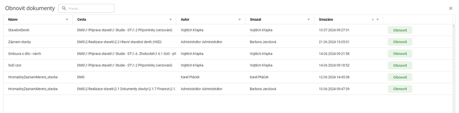 V horní liště úplně vpravo uživatel musí kliknout na tlačítko „Obnovit“. V novém okně se zobrazí tabulka s možností filtrování. V tabulce je nutné vyhledat smazaný soubor, který má být uživatelem obnoven. Po nalezení souboru uživatel musí kliknout na tlačítko „Obnovit“ v řádku daného souboru a provede se obnova smazaného souboru.