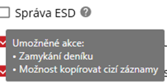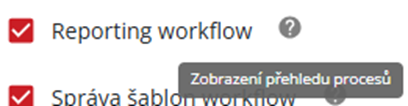 V této části jsou popsány nastavení týkající se workflow procesů. U složitějších práv jsou za názvem ikony s otazníkem. Po najetí kurzorem na otazník a počkání se zobrazí nápověda, co daná možnost znamená.