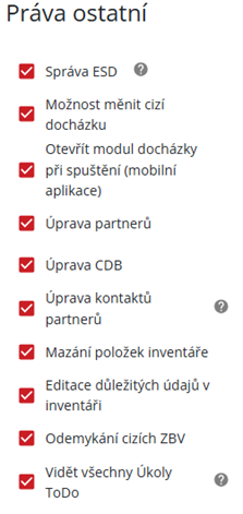 V této části budou rozepsána práva, která nezapadají do ostatních částí. U složitějších práv jsou za názvem ikony s otazníkem. Po najetí kurzorem na otazník a počkání se zobrazí nápověda, co daná možnost znamená.