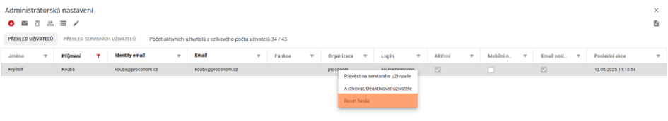 Pro resetování hesla uživatele musí uživatel v přehledu uživatelů vyvolat kontextové menu na požadovaném uživateli a kliknout na „Reset hesla“.