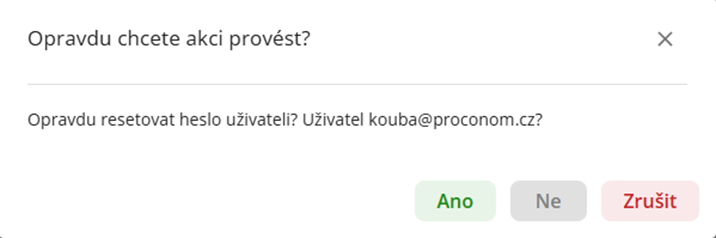 Po kliknutí se zobrazí dialogové okno, kde administrátor musí potvrdit, zda se heslo má vyresetovat a zaslat uživateli odkaz na tvorbu hesla nového.