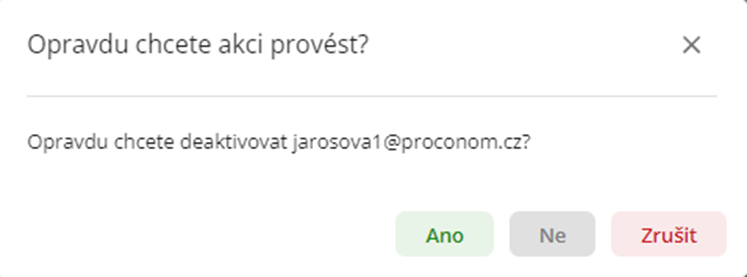 Deaktivovat uživatele lze kliknutím pravým tlačítkem myši na uživatele a zvolit možnost pro deaktivaci uživatele. Proconom se Vás v dialogovém okně zeptá, zda chcete tento krok opravdu udělat. Po potvrzení uživatel z databáze nezmizí, pouze se mu vypne checkbox u jeho jména. V tento moment se uživatel do dané databáze nepřihlásí.