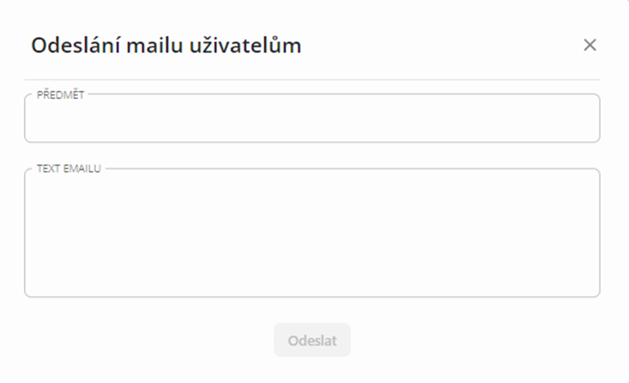 Po kliknutí na ikonu se zobrazí okno, kde administrátor vyplní předmět a text emailu. Po dokončení vyplňování administrátor emaily odešle kliknutím na tlačítko „Odeslat“ ve spodní části obrazovky.
