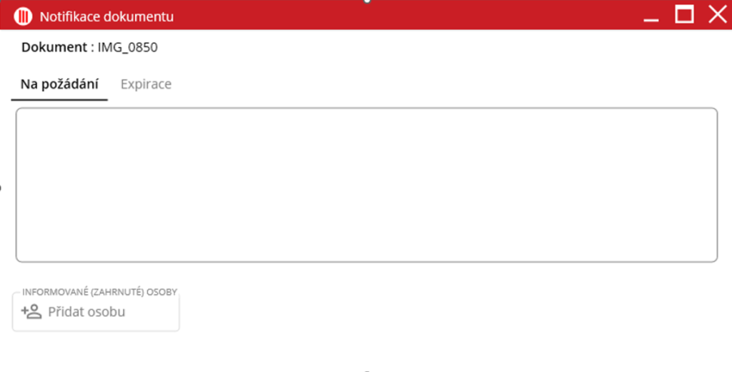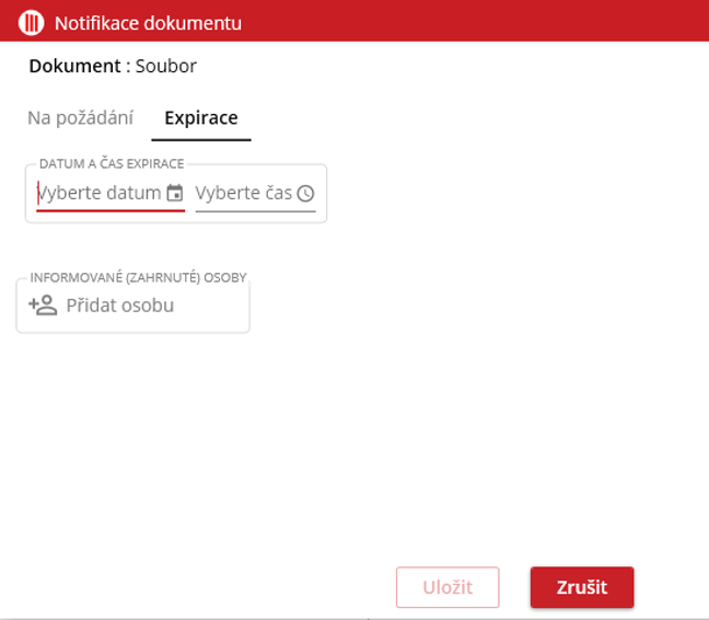 Uživatel má na výběr ze dvou možností upozornění. Buď „Na požádání“ nebo „Expirace“. U možnosti „Na požádání“ lze vytvořit jednorázovou notifikaci pro okamžité zaslání. Možnost „Expirace“ slouží pro odložené upozornění notifikovaného uživatele.