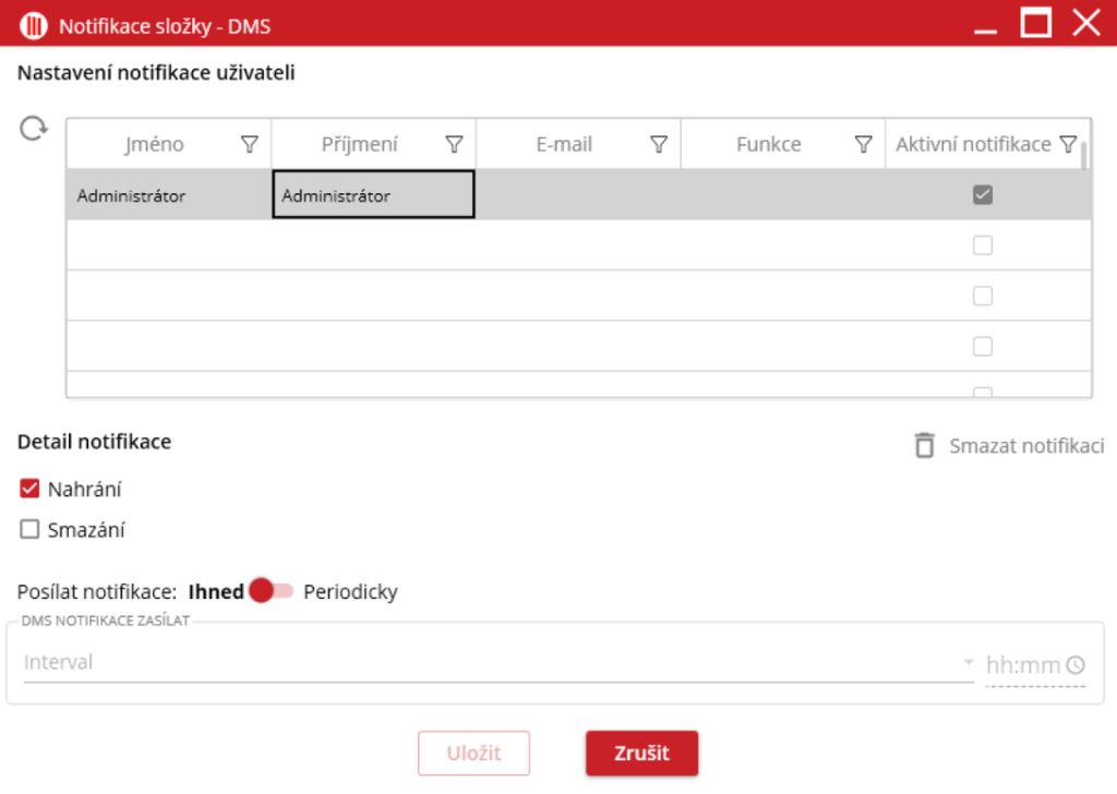 Notifikaci může uživateli nastavit i Administrátor stejným způsobem. Stačí, aby zvolil v tabulce konkrétní osobu, které chce notifikaci nastavit a postupovat dále jako vždy.