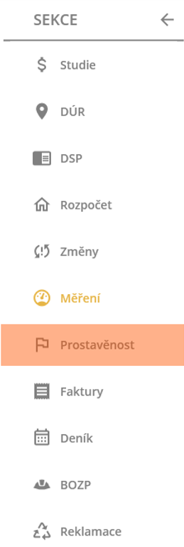 . Po kliknutí se z levé části obrazovky vysune menu sekcí, kde se nachází tlačítko “Prostavěnost“. Pro otevření modulu je zapotřebí, aby na něj uživatel kliknul levým tlačítkem myši.
