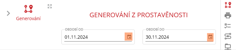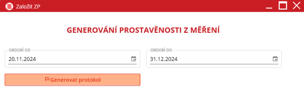 a klikne na ni. V nově zobrazeném okně se nachází dvě pole pro zapsání období, ze kterého se budou generovat data pro protokol. Vlevo se nachází pole pro začátek a vpravo konec období. Datum nastaví uživatel ručním vyplněním nebo kliknutím na ikonu kalendáře. Po nastavení období stačí kliknout na tlačítko “Generovat protokol“.