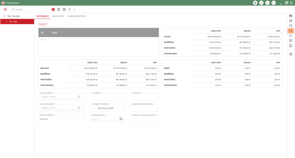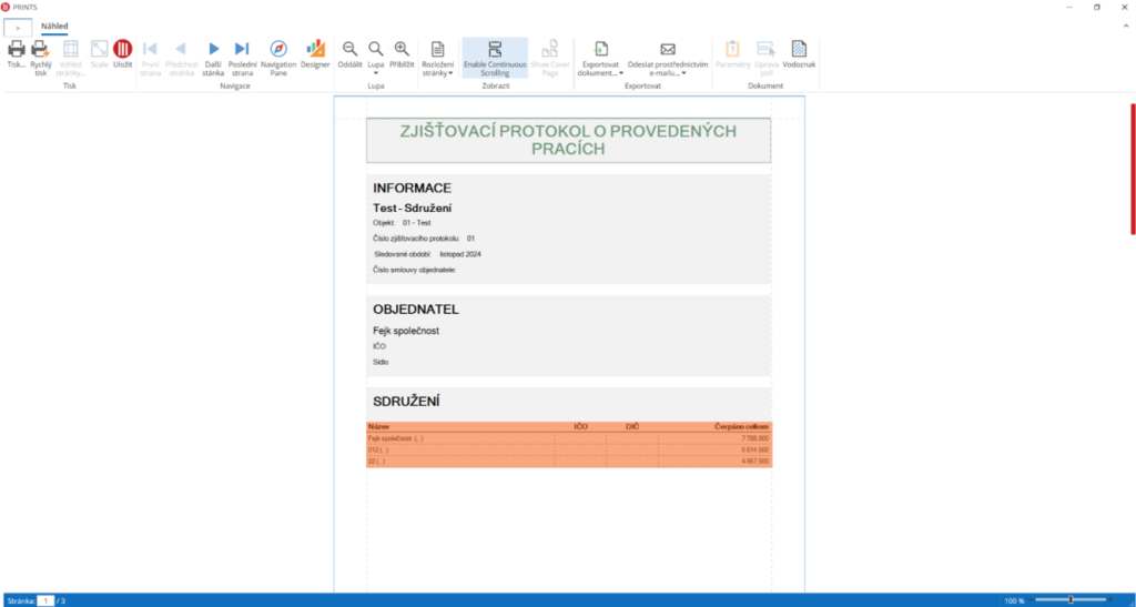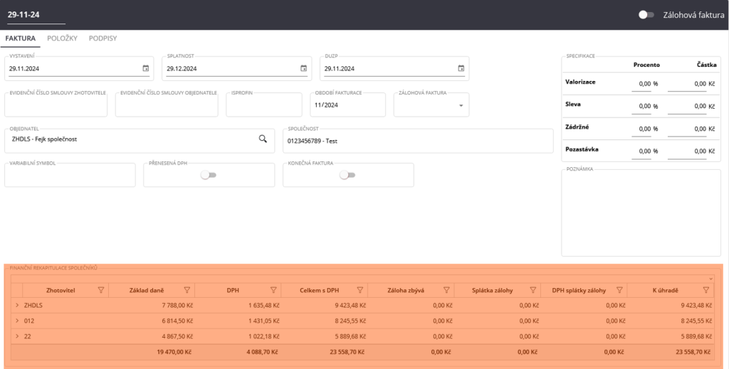 Ve vygenerované faktuře jsou uvedeny všechny prostavěné položky převzaté ze zjišťovacích protokolů. Sdružená faktura, oproti standardní faktuře, obsahuje finanční rekapitulaci společníků, která uživateli zobrazuje finální částky vyfakturované za jednotlivé účastníky sdružení.