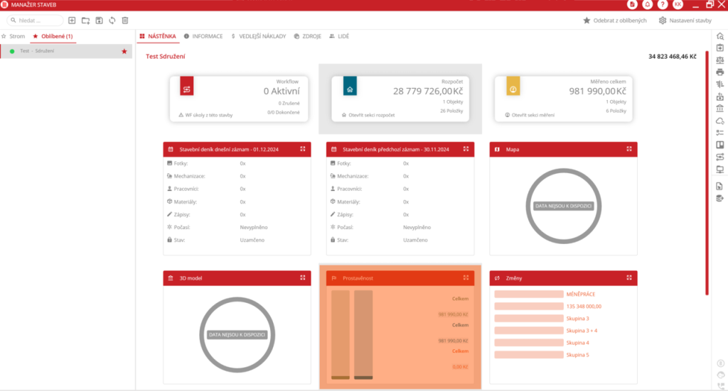 Pro otevření modulu „Prostavěnost“ uživatel musí přejít do nástěnky v okně Manažer staveb v levé části obrazovky a vybrat konkrétní stavbu.