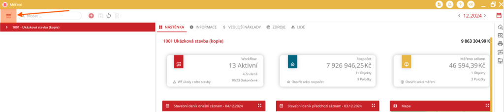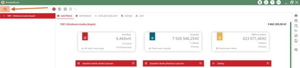 V okně detailu stavby v levém horním rohu uživatel musí kliknout na ikonu menu