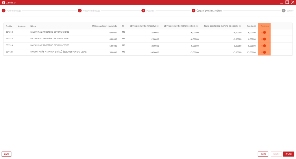 ve sloupci „Z měření“ uživatel vybere, které položky budou propsány v ZP.