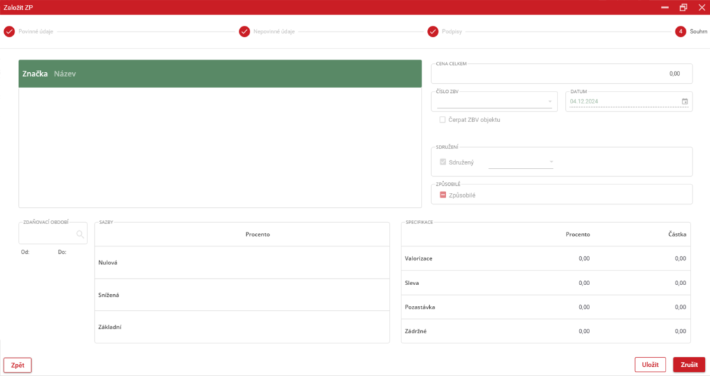 Na této stránce je zobrazen souhrn již vyplněných informací. Po kontrole stačí zmáčknout tlačítko “Uložit“ v pravém dolním rohu pro založení ZP.
