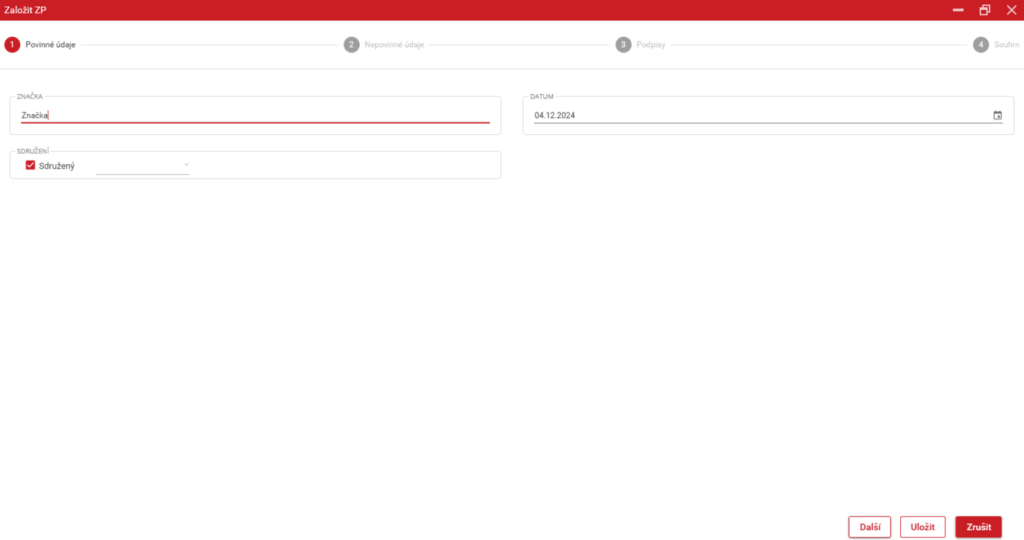 Na této stránce je nutné vyplnění všech polí. Název značky protokolu, datum daného protokolu a za pomoci checkboxu „Sdružený“ volba, zda je protokol za celé sdružení, nebo pomoci comboboxu vybrat jednoho z účastníků sdružení.