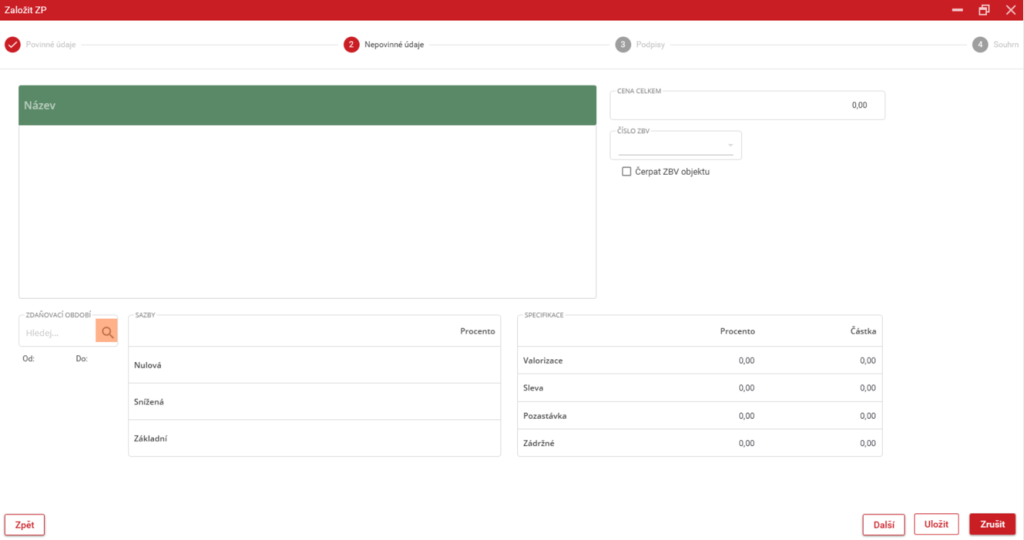 Tato stránka obsahuje nepovinné informace protokolu, které lze vyplnit. Vlevo nahoře se nachází pole pro název protokolu a pod ním pole pro popis protokolu. Pod těmito údaji lze nastavit Zdaňovací období. Pro zapsání do tohoto posle stačí zapsat přímo do pole název období. Pokud se hledaný název nezobrazí v našeptávači, tak je potřeba číselník otevřít kliknutím na ikonu lupy