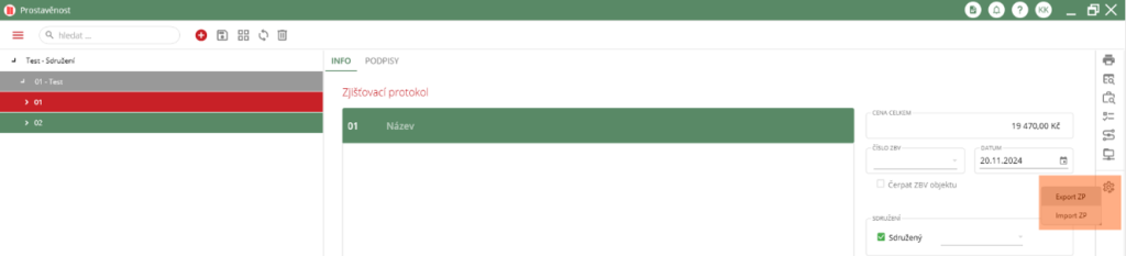Pro export Zjišťovacího protokolu je nutné, aby uživatel vybral požadovaný „Zjišťovací protokol“ ve stromovém zobrazení. Po výběru příslušného ZP uživatel přejde do pravého widgetu, kde klikne na ikonu ozubeného kolečka