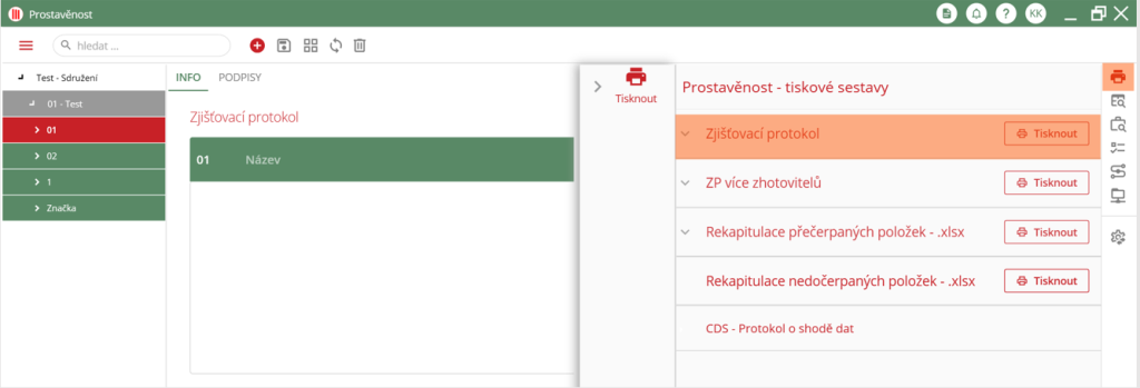Pro tisk Zjišťovacího protokolu je nutné, aby uživatel vybral požadovaný „Zjišťovací protokol“ ve stromovém zobrazení. Po výběru příslušného ZP uživatel musí přejít do pravého widgetu, kde klikne na ikonu tiskárny