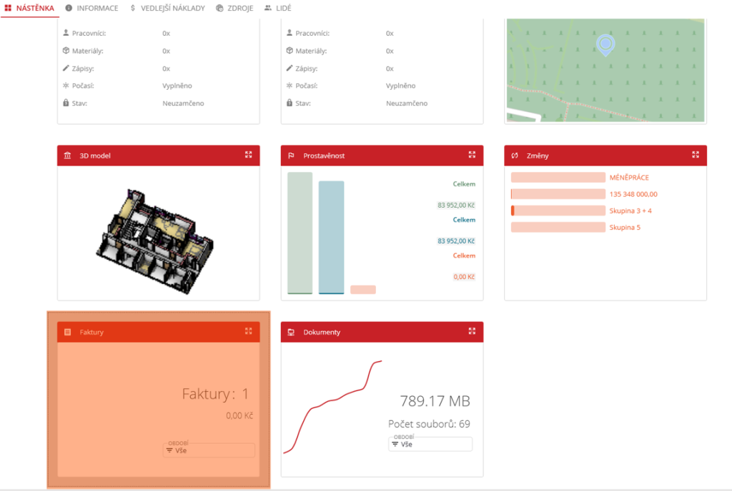 Ve stromovém zobrazení uživatel zvolí jedním kliknutím stavbu. Nyní se ve střední části obrazovky objeví Nástěnka stavby. Předmětem hledání je dlaždice Faktury ve spodní části nástěnky vlevo. Kliknutím na ikonu šipek vpravo od nadpisu panelu se otevře modul pro zvolenou stavbu, popřípadě dvojklikem na dlaždici „Faktury“.