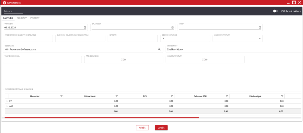 V černé hlavičce panelu vlevo se vyplňuje název faktury a vpravo lze zvolit, zda je faktura zálohová, či ne.